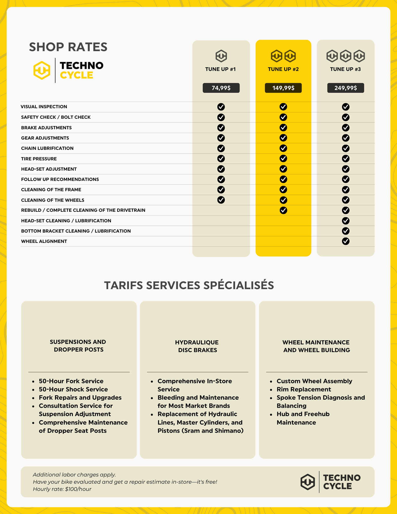 Techno Cycle's mission is to provide superior quality service tailored to everyone's needs. Everything is delivered in a relaxed atmosphere to create a customer experience that stands out. Our qualified experts who conduct the training sessions are the same ones working on your bikes, so you know you can trust them.