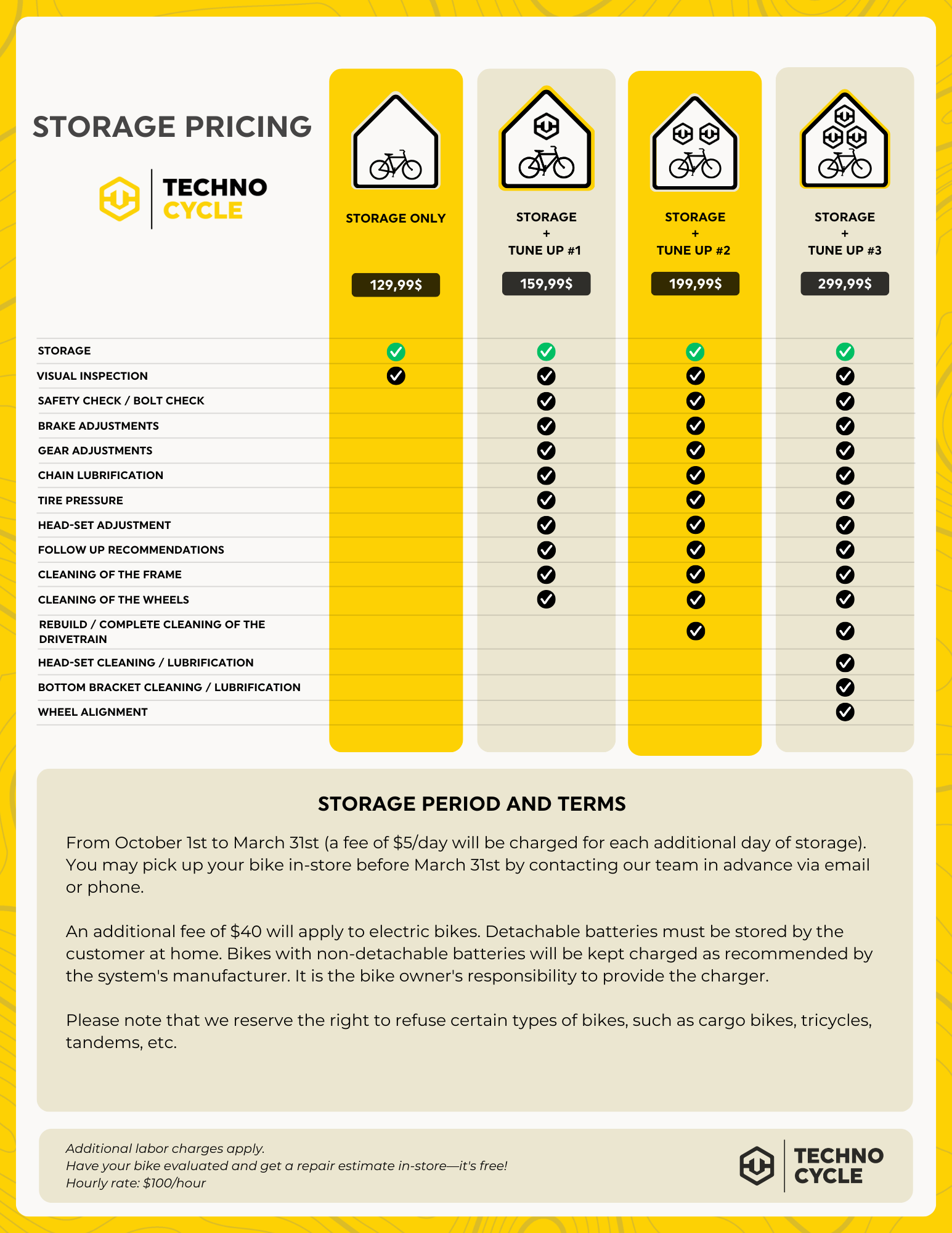 Whether it's your primary mode of transportation or your baby, we know your bike is important to you! That's why it's essential to store it properly during the winter. Let our team take care of storing it and performing a tune-up with our special Storage + Tune-up offer. Please note that spaces are limited and an additional fee of $40 will be applied for electric bikes.